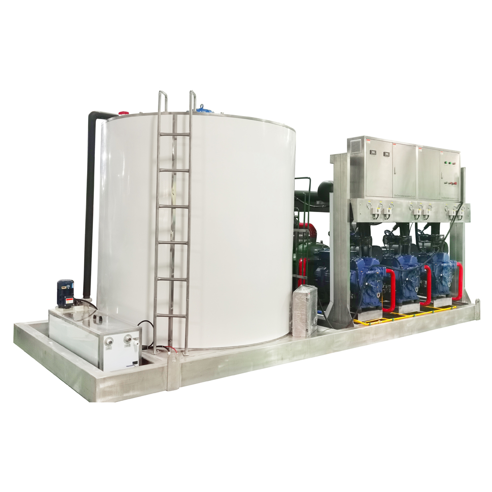 Esta unidad industrial de alta gama está diseñada para operaciones que requieren suministro continuo y masivo de hielo en escamas: plantas procesadoras, puertos pesqueros de gran volumen, plantas logísticas y centros de distribución. Con una producción de 30,000 kg / 24 h, entrega escamas finas y homogéneas de –5 °C y espesor ajustable entre 1.5–2.2 mm, optimizando contacto térmico y eficiencia en procesos de refrigeración por contacto directo.